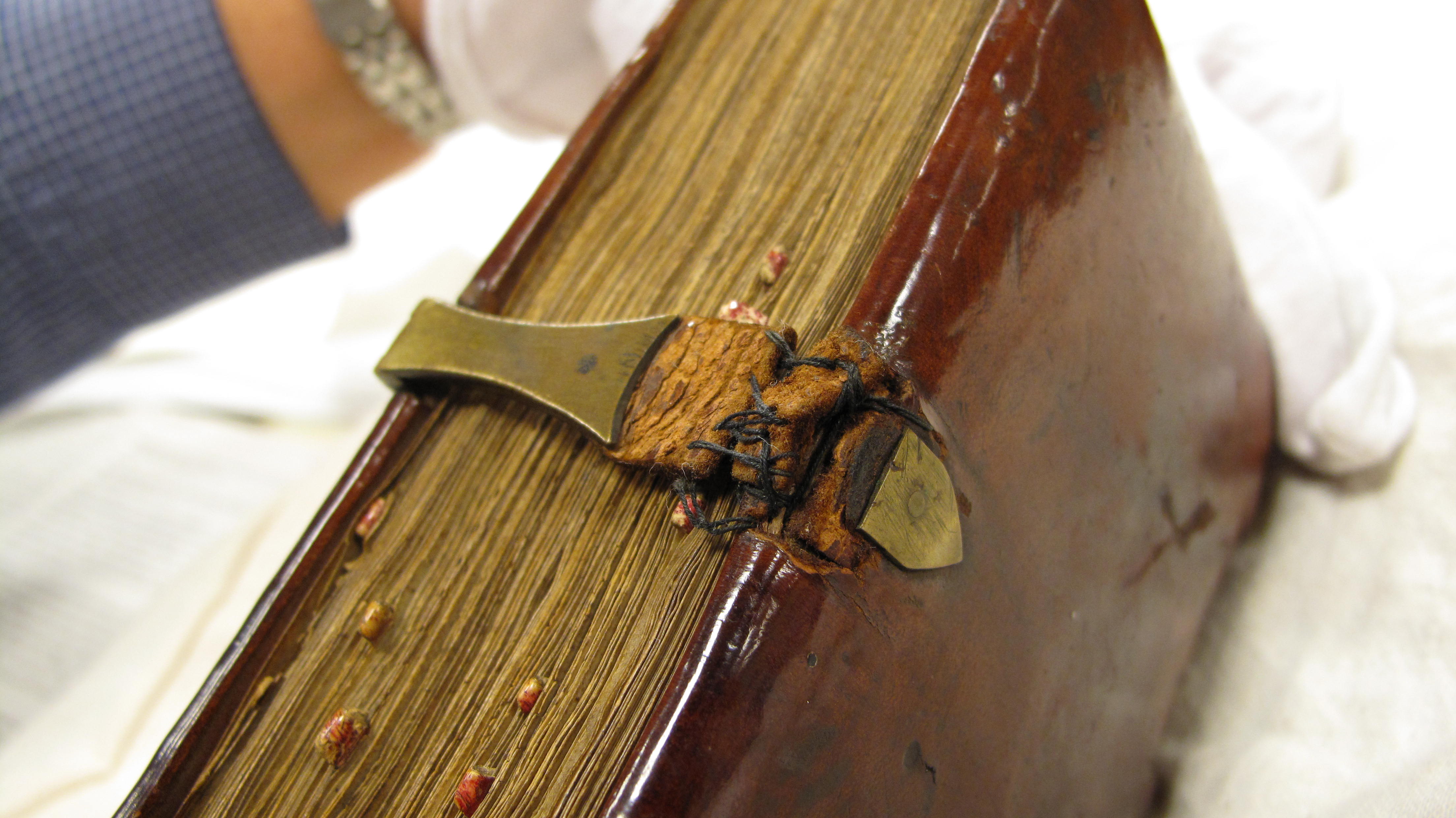 Figure 2, Auckland Libraries, Sir George Grey Special Collections, Med. MS G.140,                brass hook-clasp fastening and fore-edge book marks.