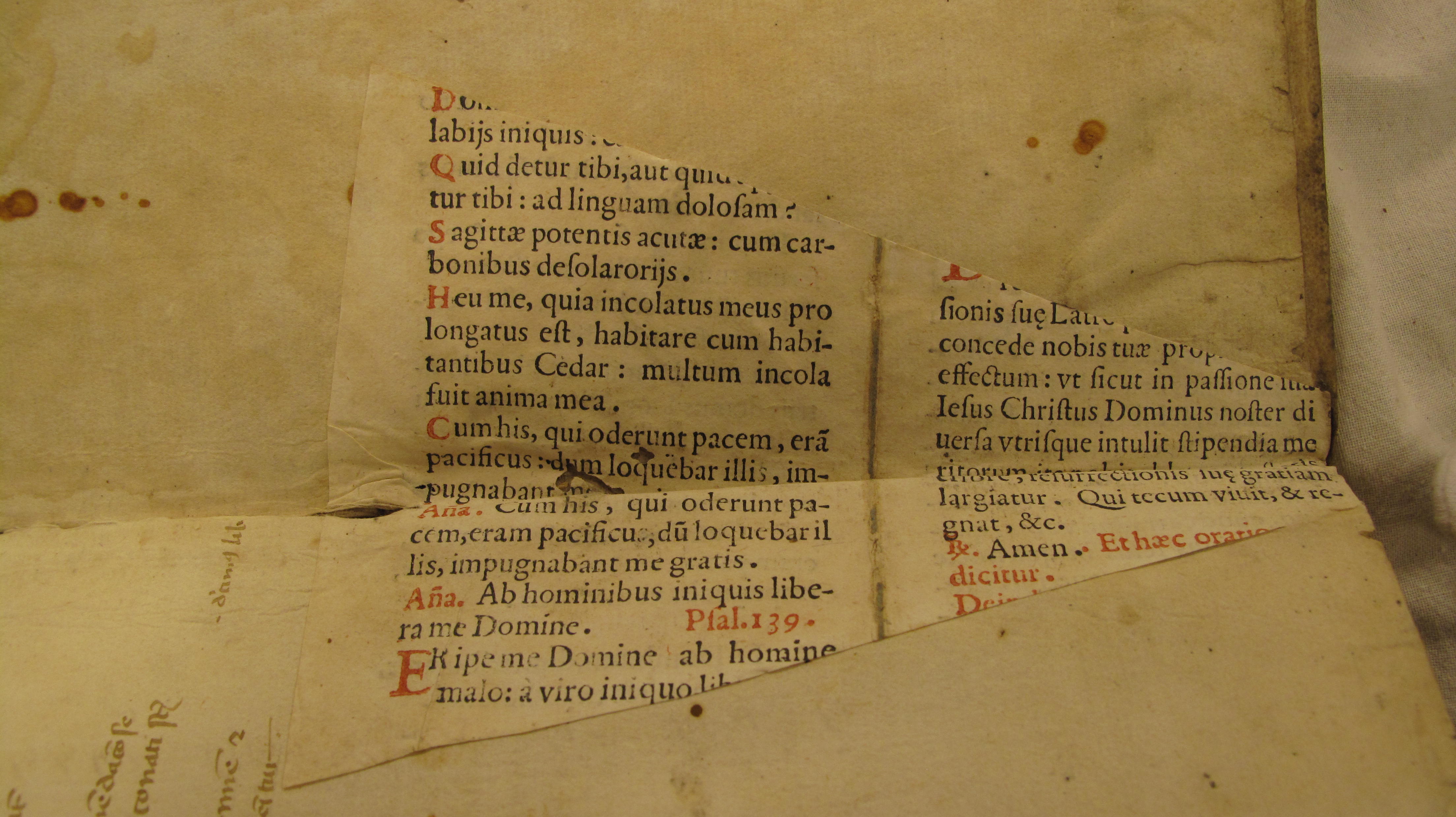 The binding of this book (Figure 1) is parchment over pulped paper pasteboards and difficult to date, but perhaps from the late sixteenth or early seventeenth century (when pasteboard became especially common).[2] The binder has strengthened the inside hinge of the lower cover with a piece of paper cut from a bifolium of a breviary (showing the collect for Maundy Thursday, antiphons, and a part of Psalms 119:3-7 and 139:2), which was printed in duodecimo in a roman fount in both red and black ink. We have not been able to date or identify this book, but it does not argue against a medieval (i.e., pre-1600) date for the binding (Figure 2).[3]