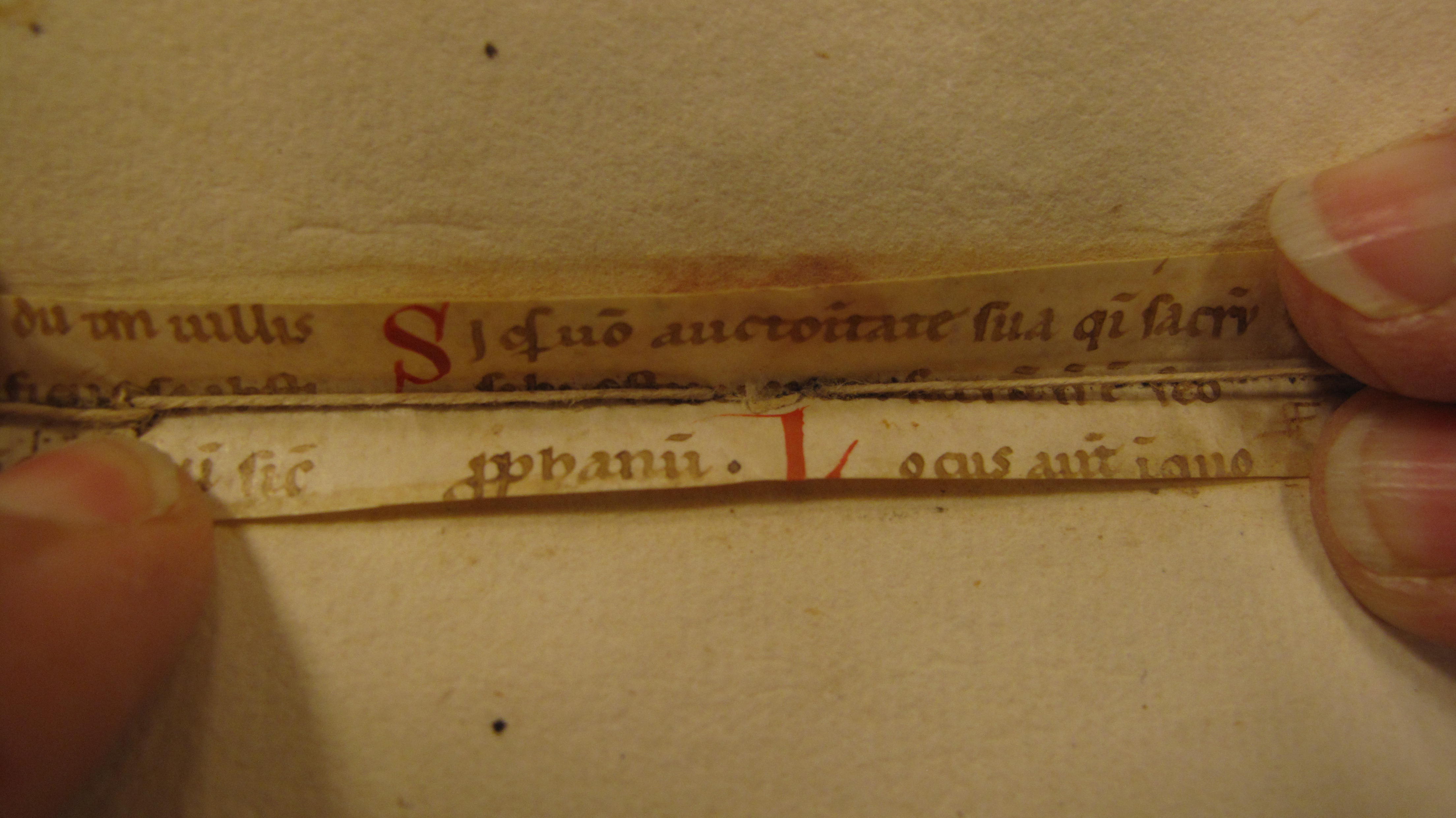 The binder has also re-used material from a fourteenth-century Italian manuscript:[4] twenty-two parchment strips have been sewn into the centre of each quire as guards to reinforce them, a common practice in paper manuscripts in the later Middle Ages (Figure 3).[5] In this case we were able to identify the fragments. They are part of a glossed copy of Book II of Justinian’s Institutes, which was a standard university textbook.
