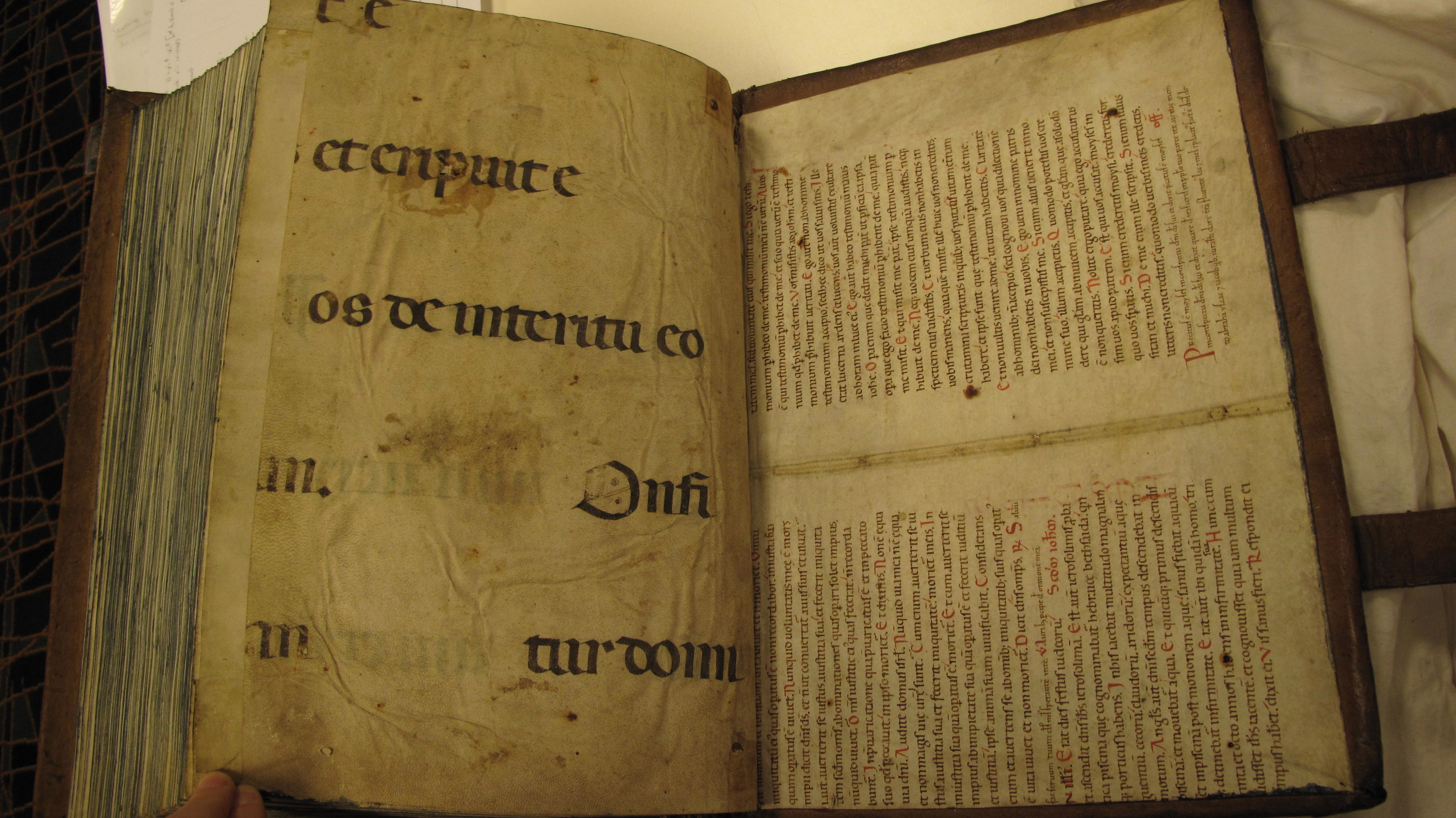 Emerging from the spine of the book are eight linen bookmarkers, now mostly in faded beige thread, but with some indications that they were once dyed green and yellow. We were unable to determine how this device was attached by the binder. Bookmarks of this kind appear in art of the late medieval period quite commonly but only rarely in books themselves. Similar bookmarks can be seen, for example, in the famous image of St Jerome removing a thorn from the lion’s paw, c.1445 (oil on panel) by Niccolo Antonio Colantonio, now in the Museo e Gallerie Nazionale di Capodimonte, Naples, Italy (a book with linen markers resembling the ones we have here appears on one of the shelves behind Jerome).[4] Several books in Exeter Cathedral Library in England contain similar bookmarks, made from long strips of tawed leather rather than linen cords (for example, Exeter Cathedral MS 3515 which has a five-tailed leather marker, the upper end of which was stitched into the leather cover over the spine).