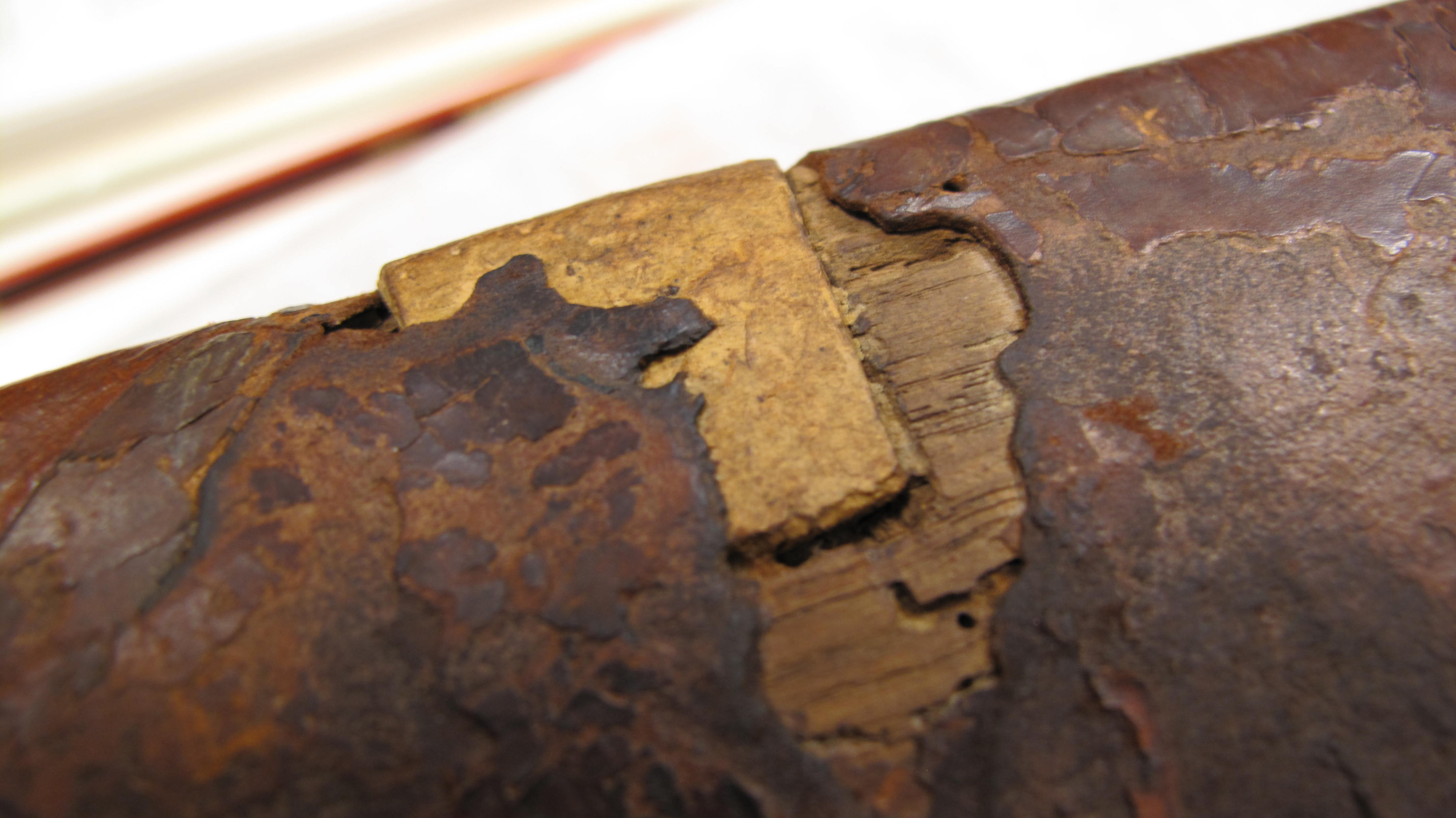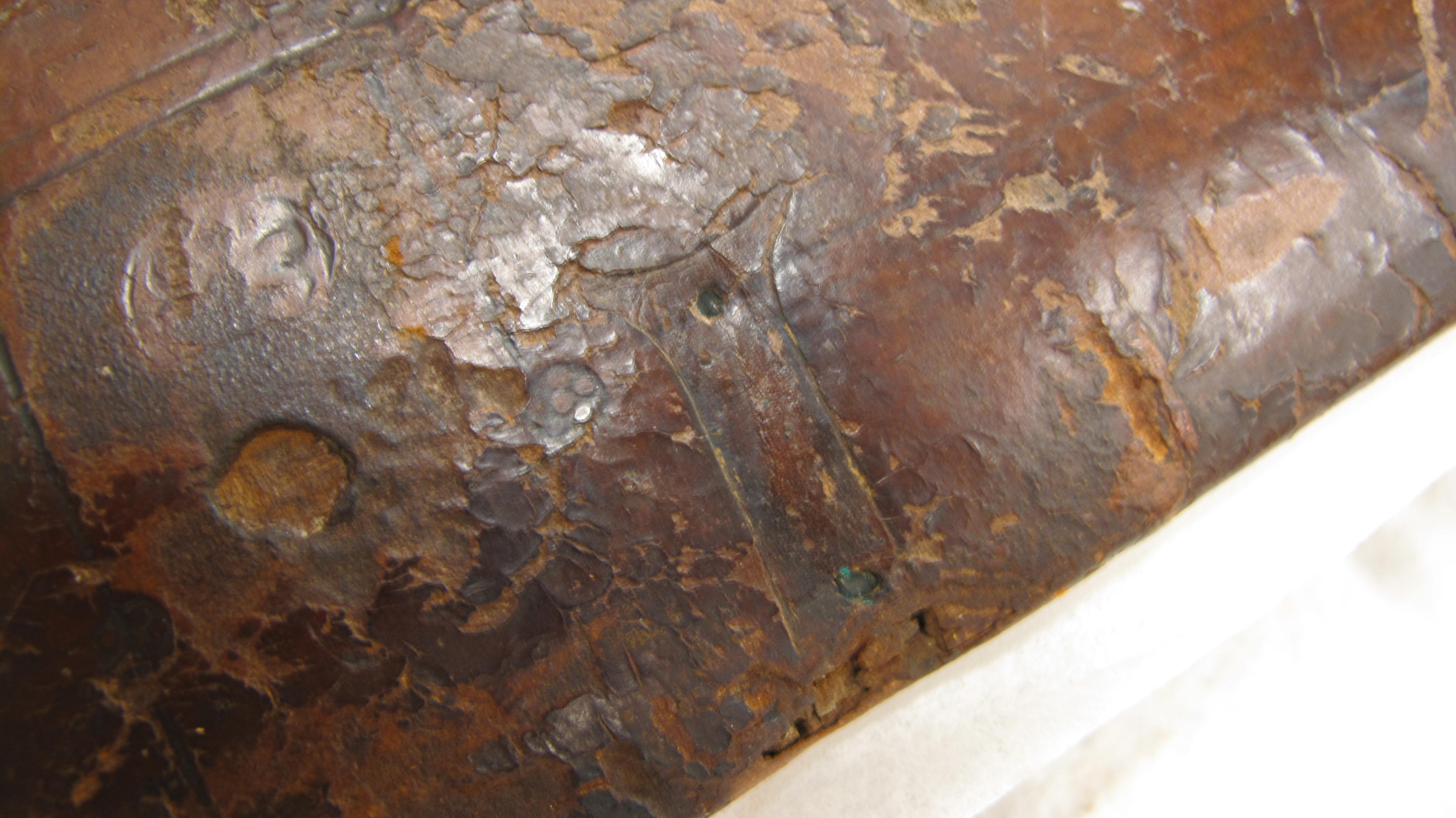 This is a paper manuscript; at or soon after the time that it was copied it was bound in contemporary blind-stamped brown calf over rounded and beveled boards. The tooling of this book, which is quite elaborate, is described in considerable detail by Manion, Vines, and de Hamel. To their notes we can add some on the book’s fastenings. These are now missing, but some traces remain: there were two of them and they were in a late-fifteenth century hook-clasp style. The catch plates have left indentations in the leather cover on the upper board. It seems they and the nails that attached them were brass (there are scraps of oxidized copper alloy in the nail holes). They may have resembled Szirmai 9.49 [g].[2] They fastened in the German style on the upper cover; on the lower cover, all that remains are pieces of the tawed straps that held the hooks, which were recessed under the cover in grooves at the edges of the board.