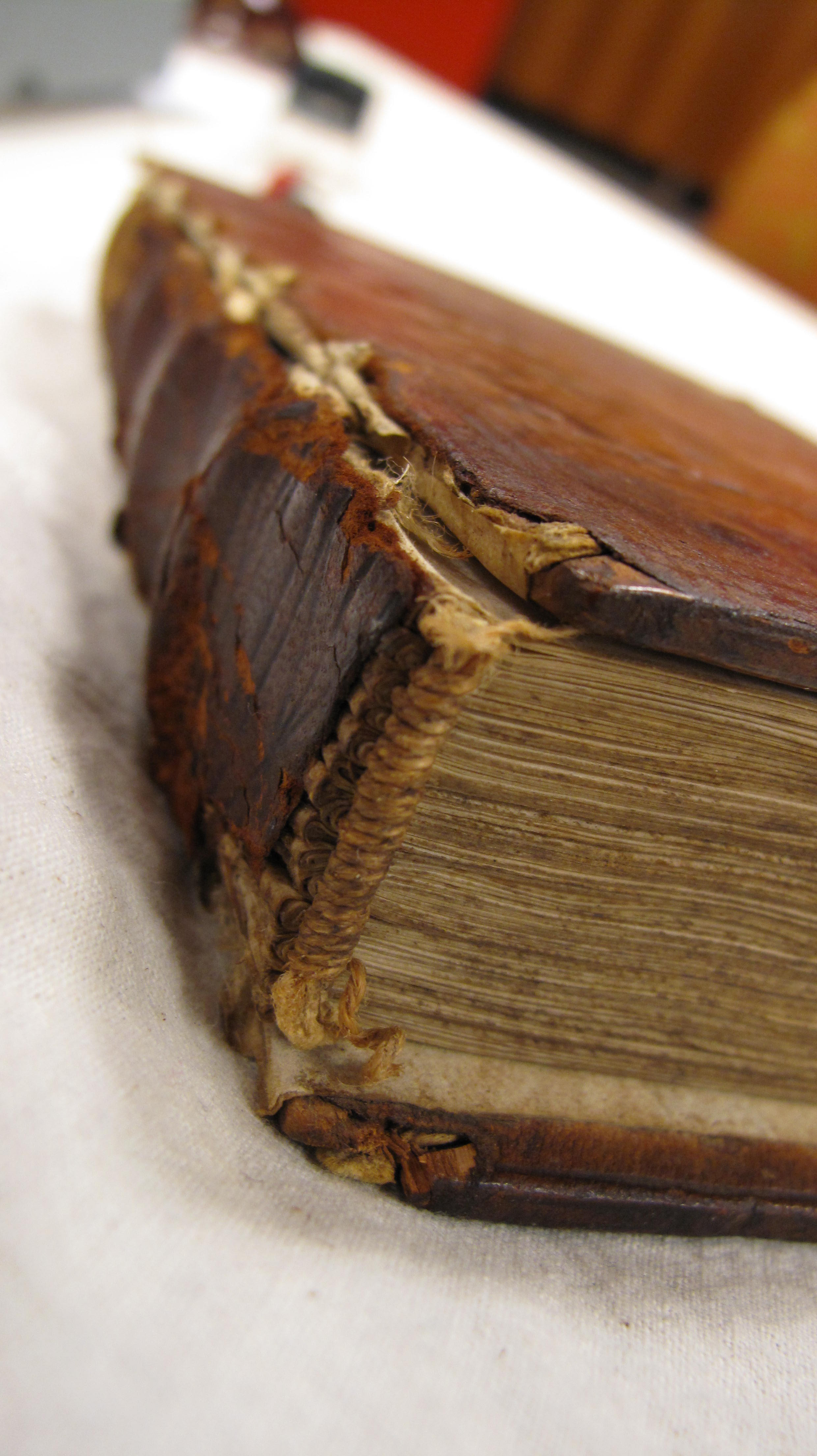 Also of interest here, in part because it is something of a contrast to the quite elaborate tooling of the cover and the use of five supports, are the book’s two endbands. These are composed of a very narrow (> 5mm diameter) core of tawed leather sewn with plain thread. The result is rather flimsy, and the attachment of the endbands to the quires is “abbreviated”—we can see only five threads attaching each band to the fifteen quires of the textblock. (More elaborate and sturdy medieval endbands were often sewn into every quire.) Like the roll, the abbreviation of endband attachment was a way to speed up the binding process, and is seen more commonly in the late fifteenth century and the era of print than earlier in the Middle Ages.[4] Endbands with abbreviated sewing were a harbinger of the “glued-on” endbands that also begin to appear in this period, providing decoration but no structural function to the book—see our blogposts on Auckland Libraries, Sir George Grey Special Collections, Med. MS S.1588 and Alexander Turnbull Library MSR-26, and the discussion of Canterbury University Library manuscript of Sallust’s De Bello Jurgurthino in our Script & Print article, pp. 215-7.